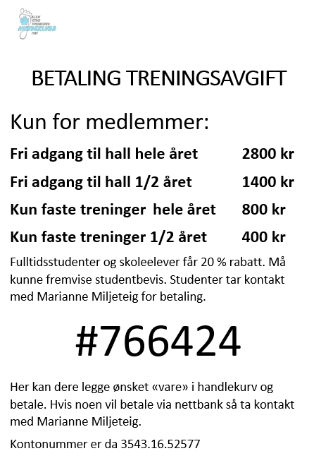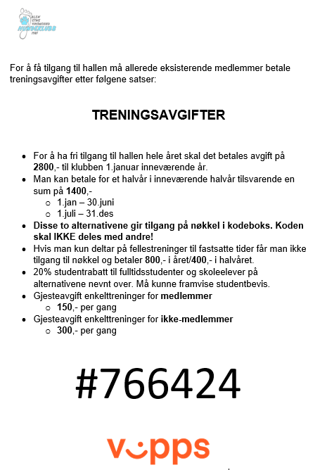 For tilgang til hallen må allerede eksisterende medlemmer betale treningsavgifter etter følgende kontingenter: