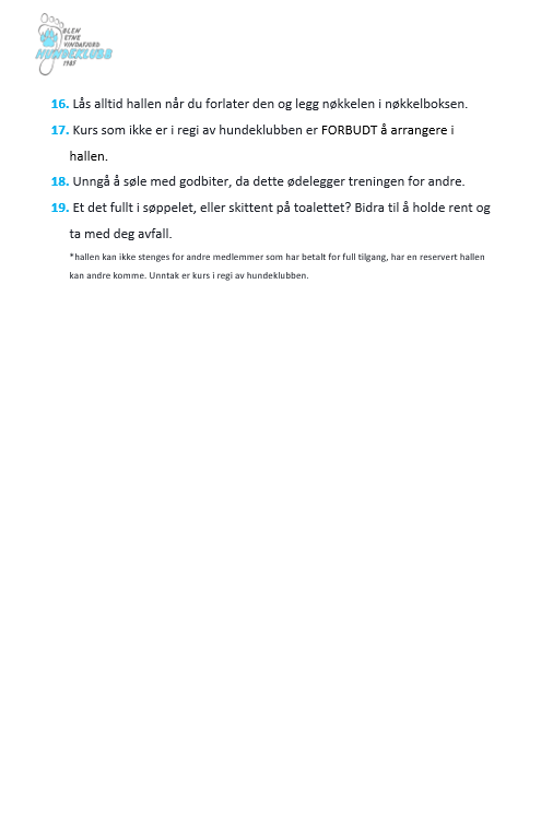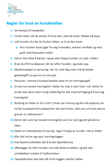 I Ølensvåg har vi en treningshall som benyttes til fellestreninger i vinterhalvåret, arrangementer, andre treninger og kurs. Hallen er 15×30 meter, har kunstgressunderlag med dempematter under. Det står agilityutstyr fremme, samt rally- og lydighetsutstyr tilgjengelig for våre medlemmer. Hallen har et eget bookingsystem i kalender som du finner HER.