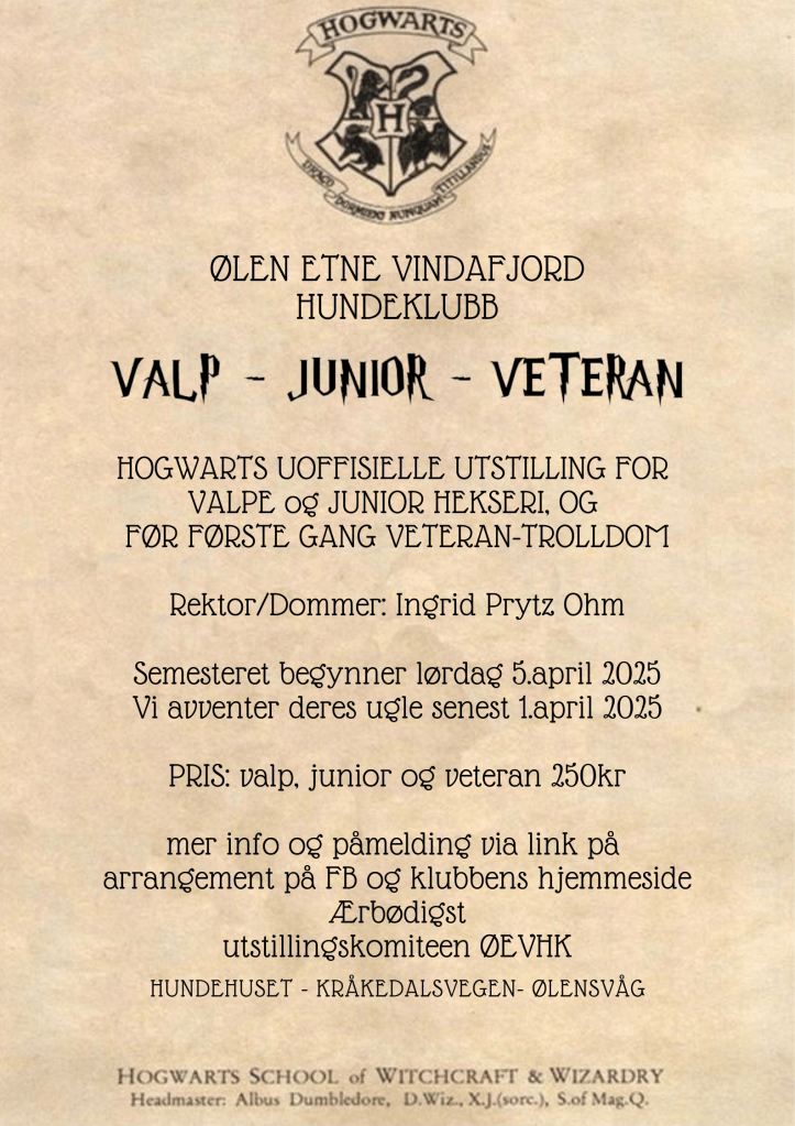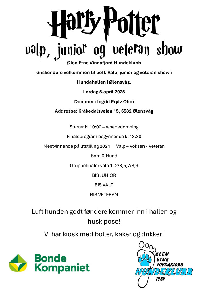 Ølen Etne Vindafjord Hundeklubb arrangerer uoffisiell valp og junior utstilling 5.april 2025 i Hundehuset i Ølensvåg. Dommer: Ingrid Prytz Ohm – kennel All Trade